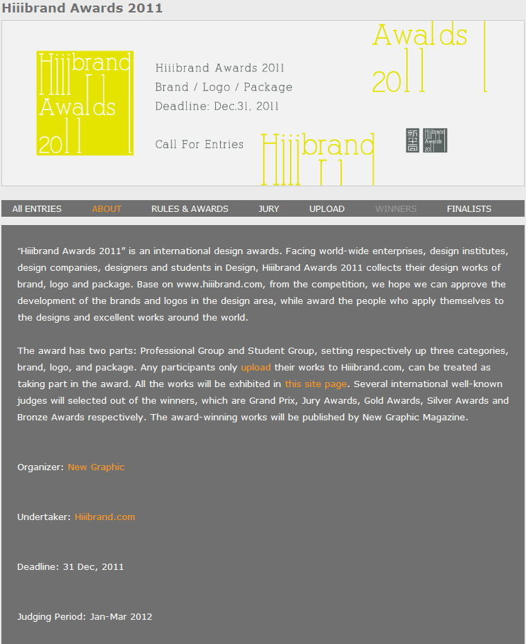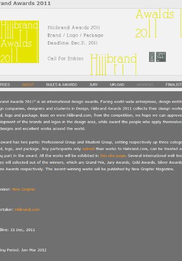 “Hiiibrand Awards 2011”은 국제 디자인 어워드로, 전세계의 기업, 디자인학교, 디자인 업체, 디자이너와 학생들을 대상으로 브랜드, 로고 그리고 패키지 디자인 작품을 공모합니다.