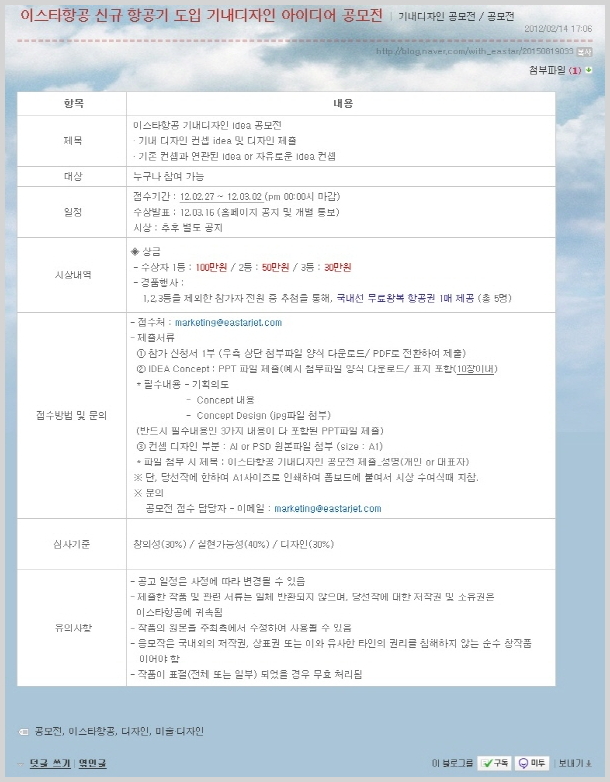 * 파일 첨부시 제목: 이스타항공 기내디자인 공모전 제출_성명(개인 또는 대표자)