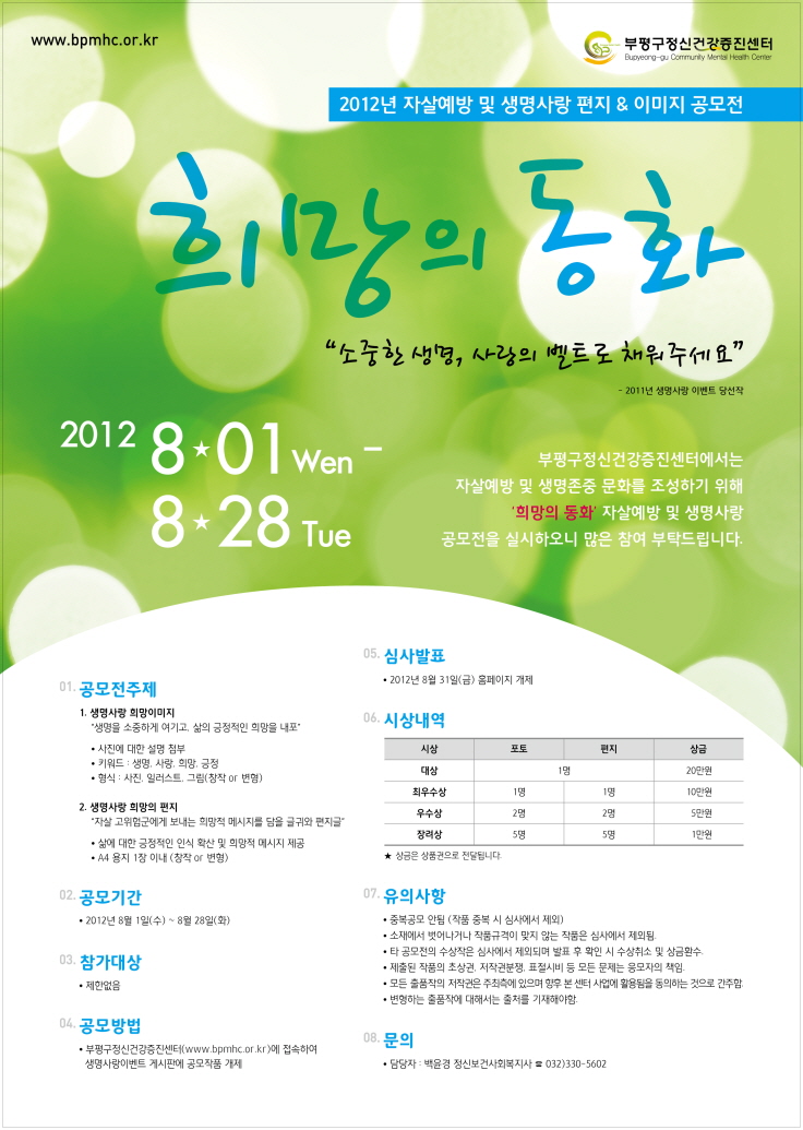 -부평구정신건강증진센터(www.bpmhc.or.kr)에 접속하여 생명사랑이벤트 게시판에 공모작품개제