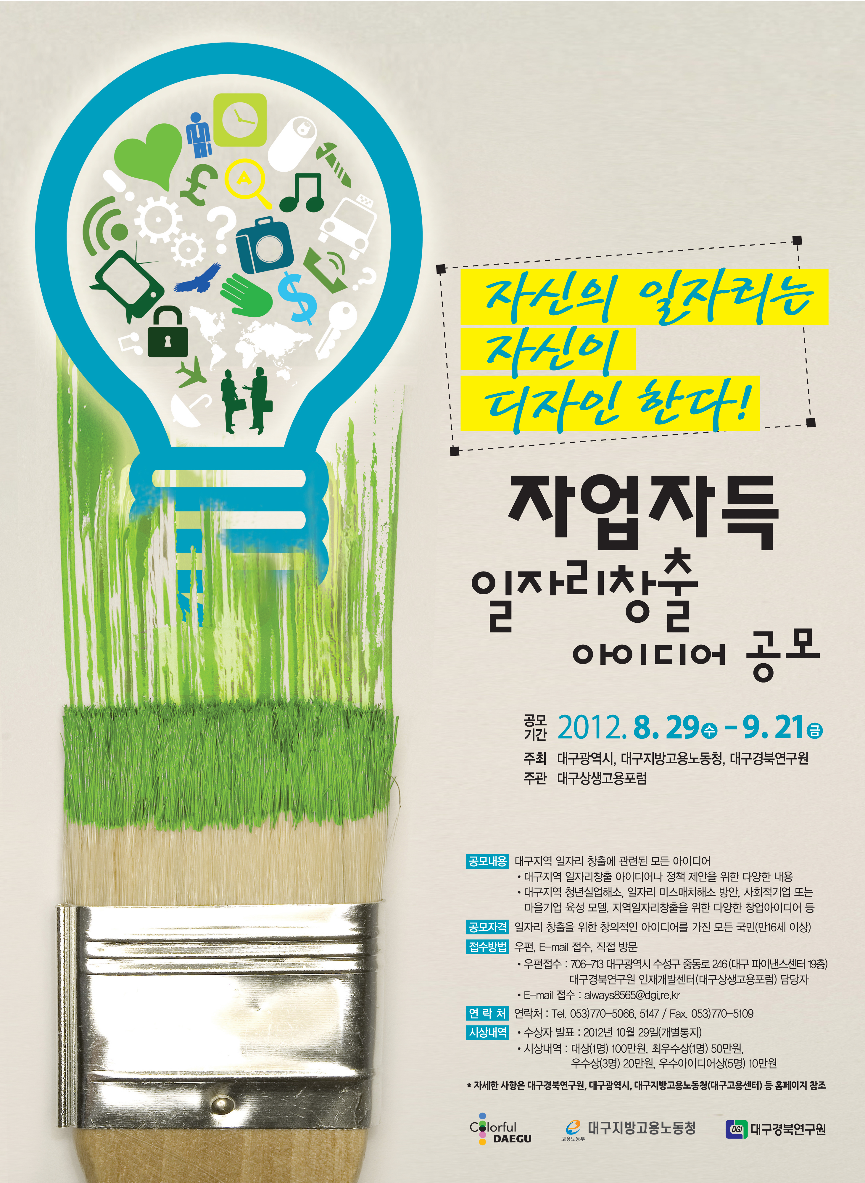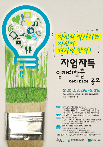 2012년 자업자득(自業自得) 일자리창출 아이디어 공모전 대구지역의 고용문제 해결을 위한 국민들의 관심과 참여를 제고하고 생활에 바탕을 둔 창의적 일자리 창출을 위한 아이디어를 발굴하고자 대구광역시 "자업자득(自業自得) 일자리창출 아이디어 공모전"을 붙임과 같이 실시하오니 많은 참여 바랍니다.