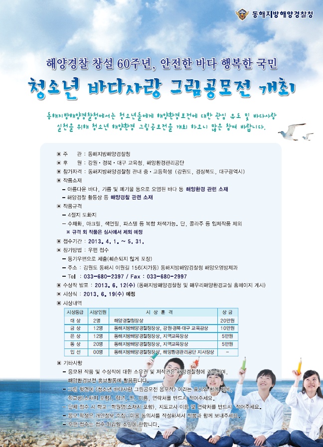 동해지방해양경찰청에서는 청소년들에게 해양환경보전에 대한 관심 유도 및 바다사랑 실천을 위해 청소년 해양환경 그림공모전을 개최 하오니 많은 참여 바랍니다.