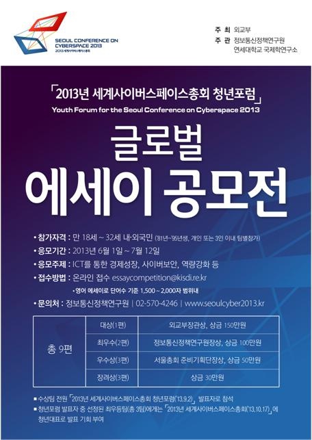 - 외교부는 정보통신정책연구원(KISDI) 및 연세대학교 국제학연구소와 공동으로 오는 「2013년 세계사이버스페이스 총회」(이하 서울 총회)를 맞이하여 글로벌 에세이 공모전을 개최합니다.