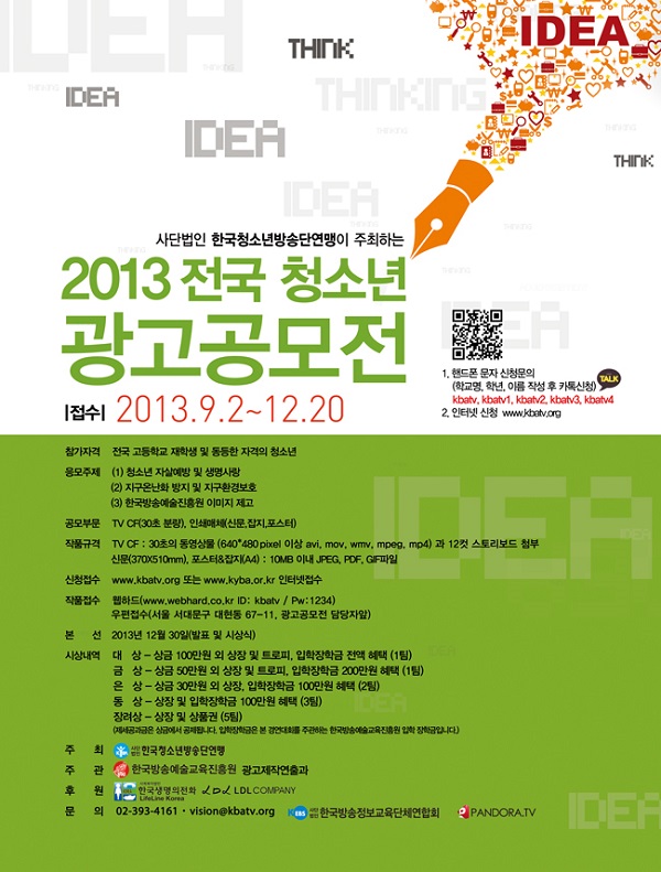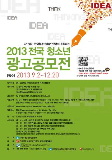 - 문의처 2013 전국 청소년 광고공모전 담당 (Tel 02-393-4161) mgahn@kbatv.org