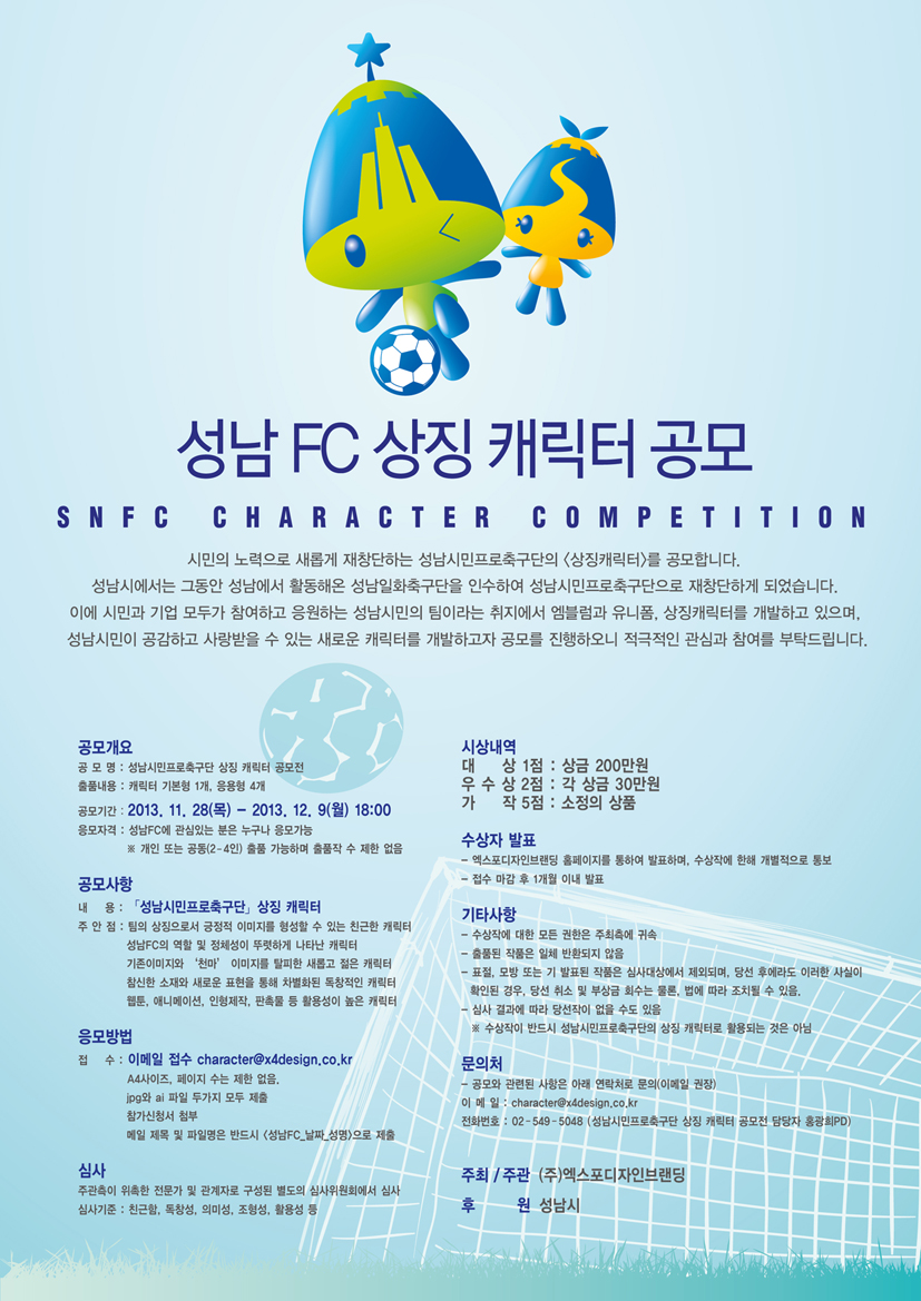 - 전화번호 : 02-549-5048 (성남시민프로축구단 상징 캐릭터 공모전 담당자 홍광희PD)