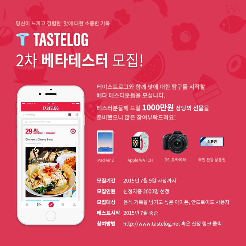‘맛’과 ' 음식' 포스팅에 특화된 앱 ‘Tastelog’ 에서 베타테스터를 모집합니다. 최신 앱을 출시 전에 써보고 푸짐한 선물(아이폰6플러스, 아이패드 Air, DSLR, 각종 외식상품권 등) 받아가실 분! 베타테스터로 신청해주세요! 테이스트로그 베타테스트 신청하기!! https://docs.google.com/a/tastelog.net/forms/d/1x9gJvziVmt59HlsgRTwiHB5D9-b9jpZ8hWWhwv-zbos/viewform
