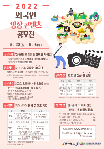 - 제출서류 : 외국인 영상콘텐츠 공모전 응모신청서 1부, 참가자 외국인 증빙서류 1부, 개인정보 수집 및 이용 동의 1부