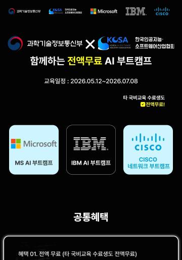 - 참여 관계사의 폭 넓은 취업 지원 (과기부/한국소프트웨어산업협회/시스코/솔데스크등)