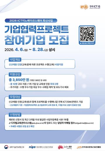 전북특별자치도 내 ICT/SW 기업으로 교육생과 함께기업 내 프로젝트(AI, BC, 데이터, IoT, 콘텐츠 분야 등) 수행 및 해당 교육생 대상 신규채용 계획이 있는 기업