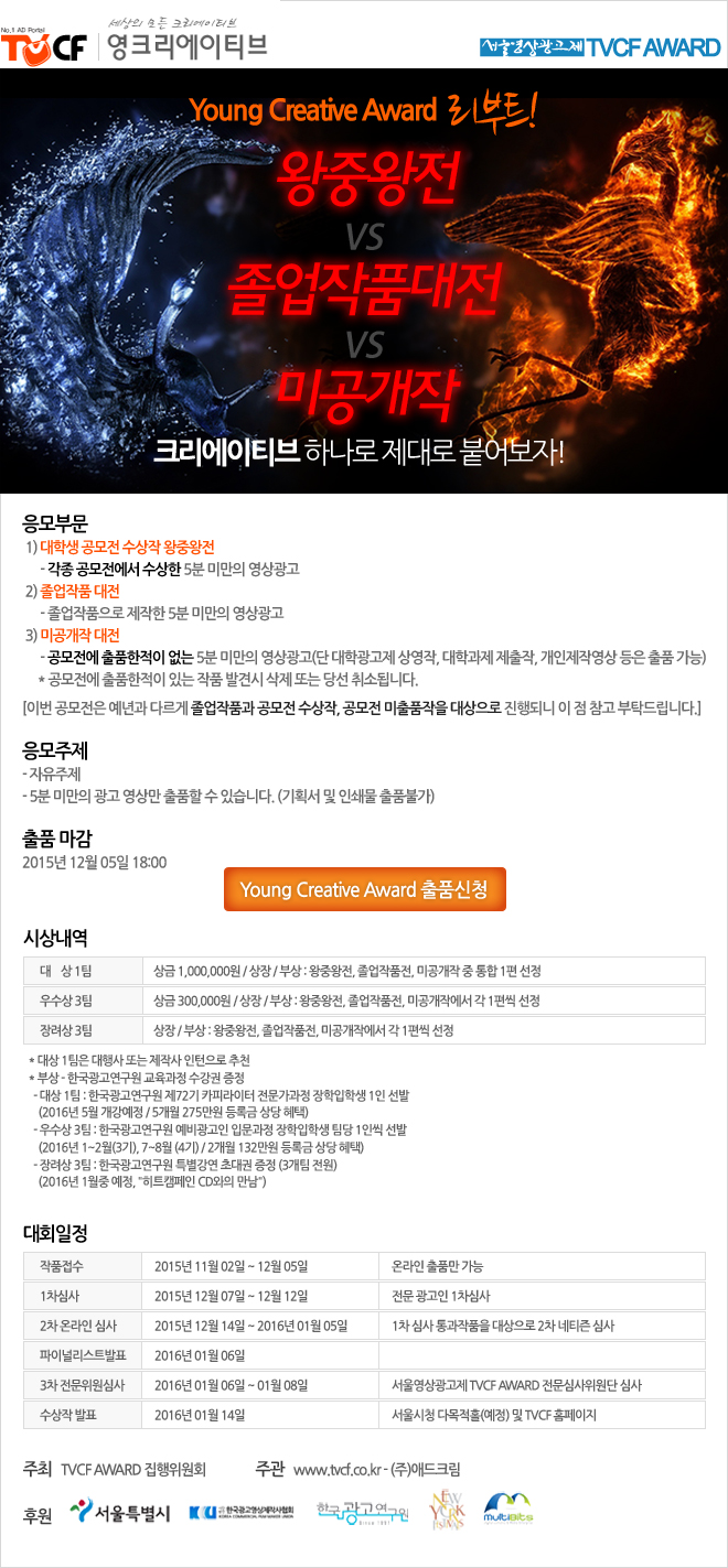 - 수상작 발표: 2016년 01월 14일 서울시청 다목적홀(예정) 및 TVCF 홈페이지