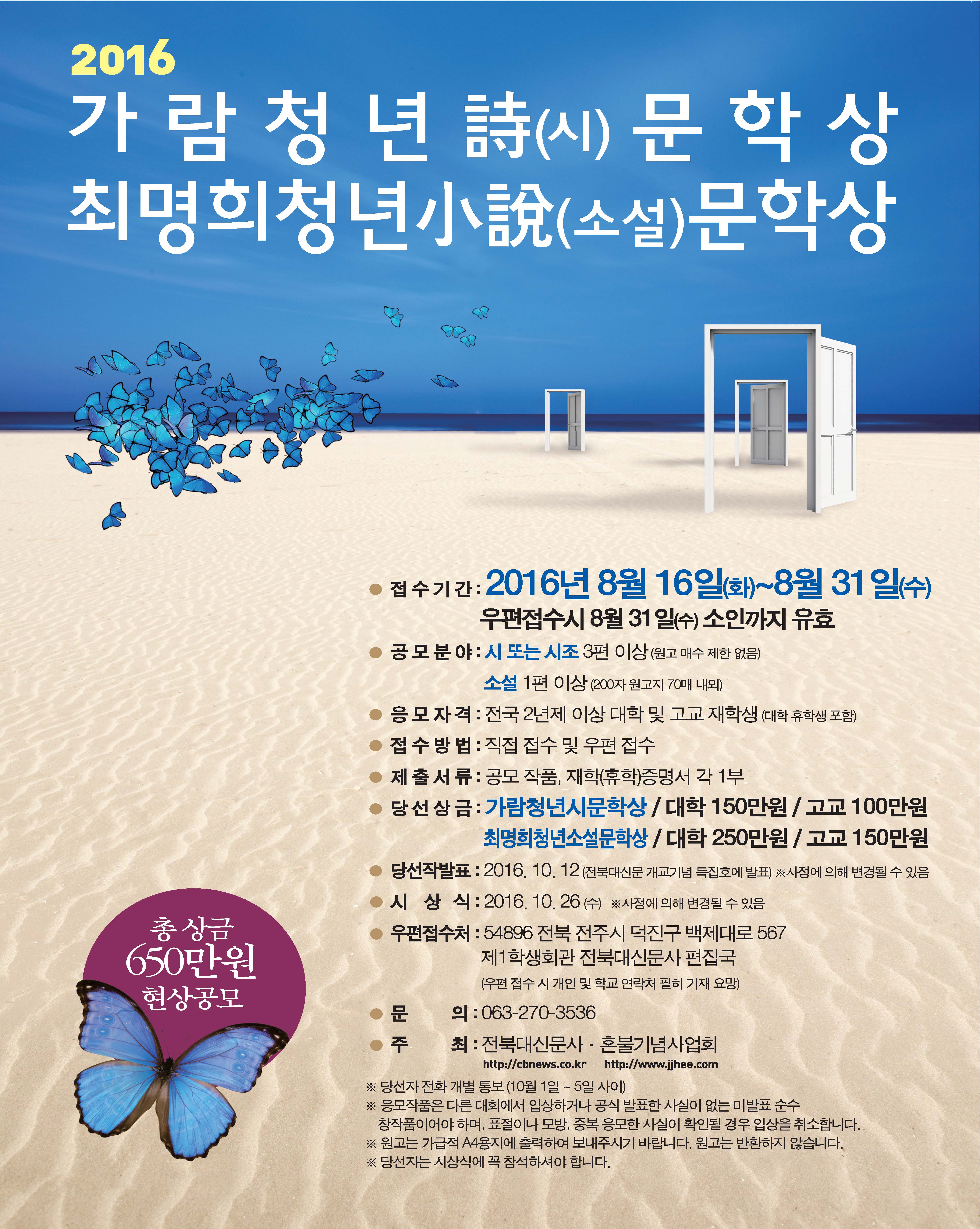 - 최명희청년소설문학상 / 대학 250만원 / 고교 150만원