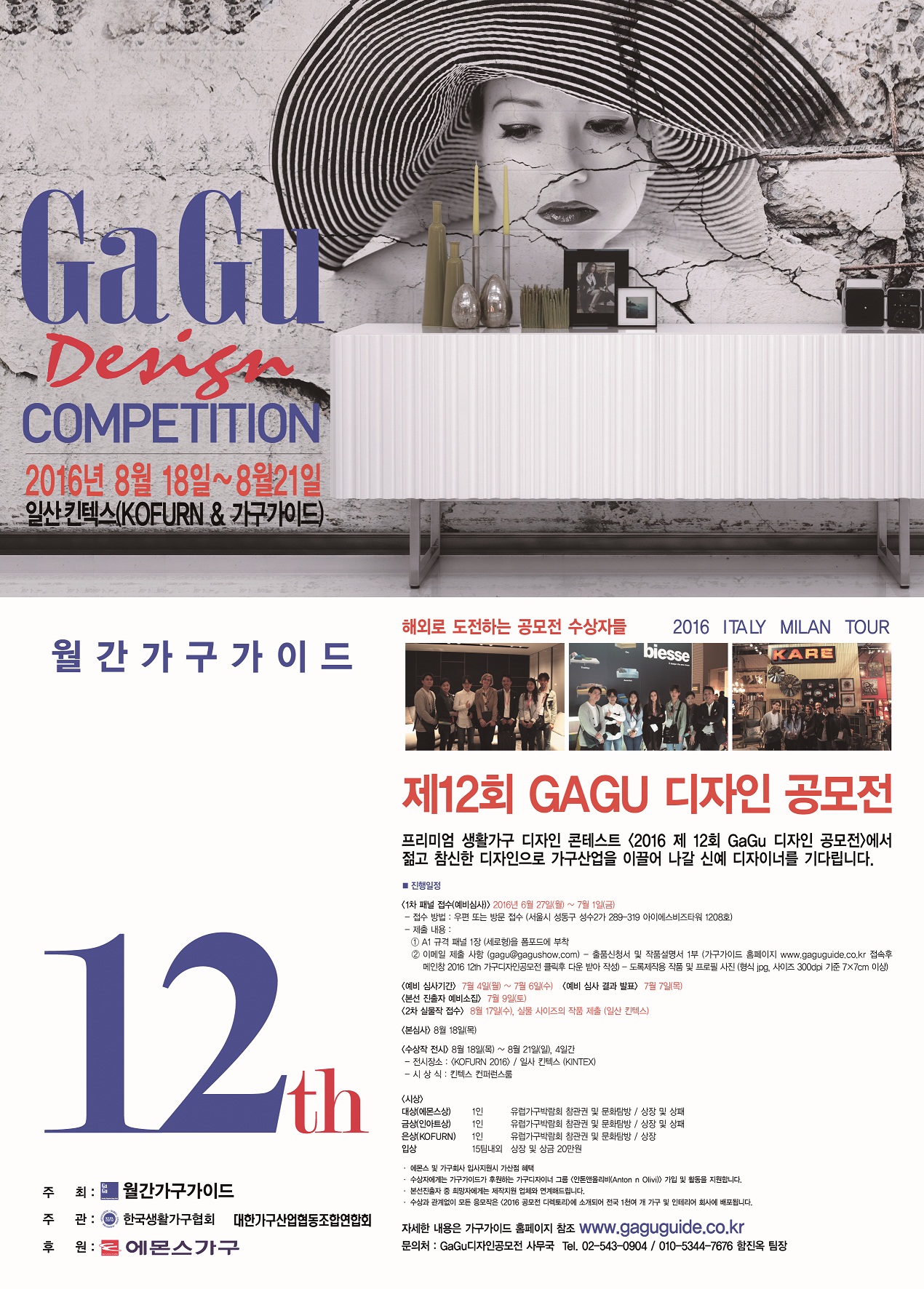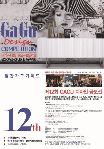 프리미엄 생활가구 디자인 콘테스트 < 2016 제12회 GaGu 디자인 공모전> 에서 젊고 참신한 디자인으로 가구산업을 이끌어 나갈 신예디자이너를 기다립니다. 아름다운 가구, 실용적인 아이디어를 가진 역량 있는 디자이너들의 적극적인 참여 바랍니다.