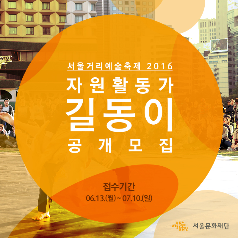 (재)서울문화재단에서는 대한민국 대표 거리예술축제! 서울거리예술축제2016 (前, 하이서울페스티벌)을 함께 만들어갈 ‘길동이’를 공개모집합니다. 서울 도심 곳곳을 누비며 서울의 매력을 탐구하고, 예술가 및 시민과의 관계 맺기를 통해 잊혀져가는 서울의 정을 느껴보세요. 새로운 실험과 발견이 가득한 서울의 거리예술을 가장 가까운 곳에서 함께할 호기심과 열정 가득한 여러분의 많은 관심과 참여를 기다립니다. 2016년 06월 10일 (재)서울문화재단 대표이사 공지 바로보기 클릭☞http://www.sfac.or.kr/html/opensquare/notice.asp 신청하러 가기 클릭☞ http://me2.do/GYkSESrJ