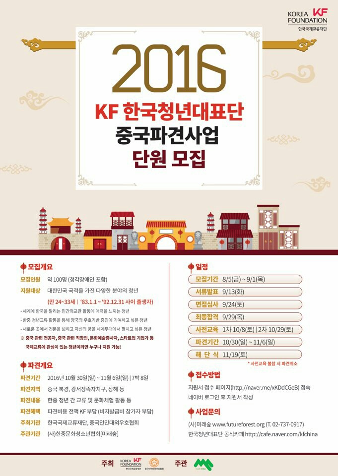[KF/미래숲] 2016년도 한국청년대표단 중국파견사업 단원 모집