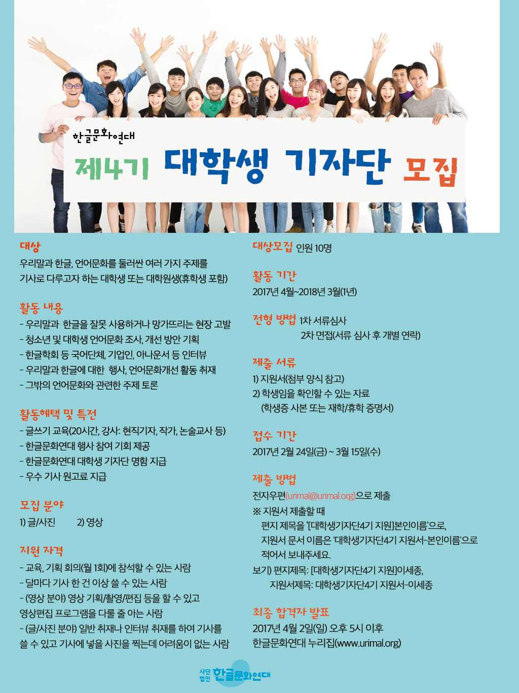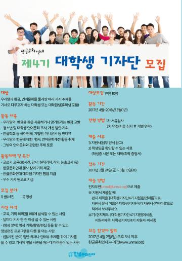 - 우리말과 한글, 언어문화를 둘러싼 여러 가지 주제를 기사로 다루고자 하는 대학생 또는 대학원생(휴학생 포함)