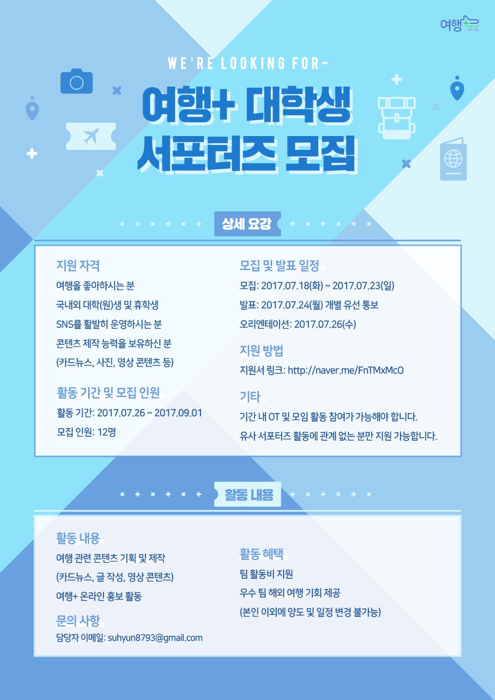 여행을 좋아하는 국내외 대학(원)생 및 휴학생이라면 누구나 지원이 가능합니다. 서포터즈 활동 기간 동안 여행+의 온라인 홍보를 위한 미션을 수행하고, 여행과 관련된 다양한 형식의 콘텐츠를 제작하게 된답니다. 또한 여러 미션 활동을 통해 선정된 가장 우수한 팀에게는 해외 여행 기회가 제공됩니다! 여행+ 서포터즈 활동을 통해 여행도 하고, 스펙도 쌓고, 팀워크도 기를 수 있는 일석삼조의 기회를 잡아보세요!
