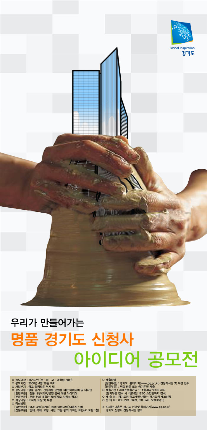 우리 경기도에서는 청사, 의회 청사를 광교 신도시 내로 이전을 추진하고 있습니다. 명품 경기도 청사를 건축하기위해 도민 여러분의 폭넓은 아이디어를 공모하오니 많은 응모 바랍니다.