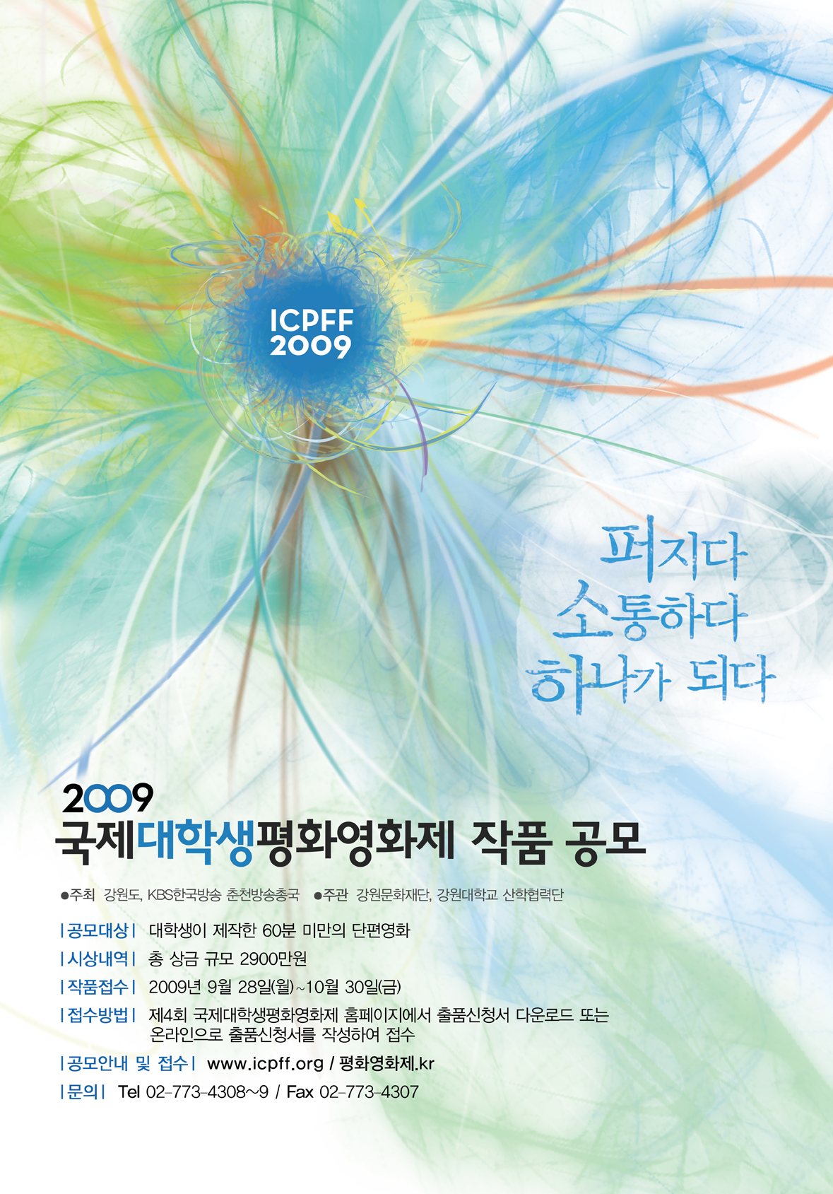 강원도(도지사:김진선)와 한국방송 춘천방송총국이 공동주최하고, 강원문화재단(이사장:김진선)과 강원대학교(총장:권영중)가 주관하는 2009 국제대학생평화영화제(ICPFF 2009)가 경쟁부문 작품 접수를 오는 9월 28일부터 10월 30일까지 시작한다.(총 상금 규모 2900만원)