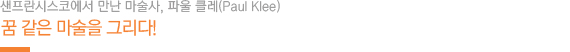 아이들이 가진 순수함, 그 원초적인 상태로 돌아가 동화 같은 추상회화를 추구했던 파울 클레의 작품들을 동화 같은 도시, 샌프란시스코에서 만났다. 표현주의 화파의 중 색채를 중시했던 청기사파의 회원이었으며, “색채와 나는 하나다” 라는 일념으로 일생 동안 파격적인 색채와 선을 사용하면서 대담한 페인팅을 했지만 순수함을 잊지 않았던 화가, 파울 클레의 일러스트 같은 회화를 소개한다.