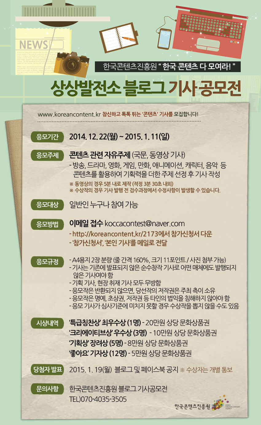 여러분이 열광하는 콘텐츠에 참신한 아이디어와 기획력을 더해주세요! 한국콘텐츠진흥원 공식 블로그 ‘상상발전소’에서 여러분의 기사를 기다립니다.