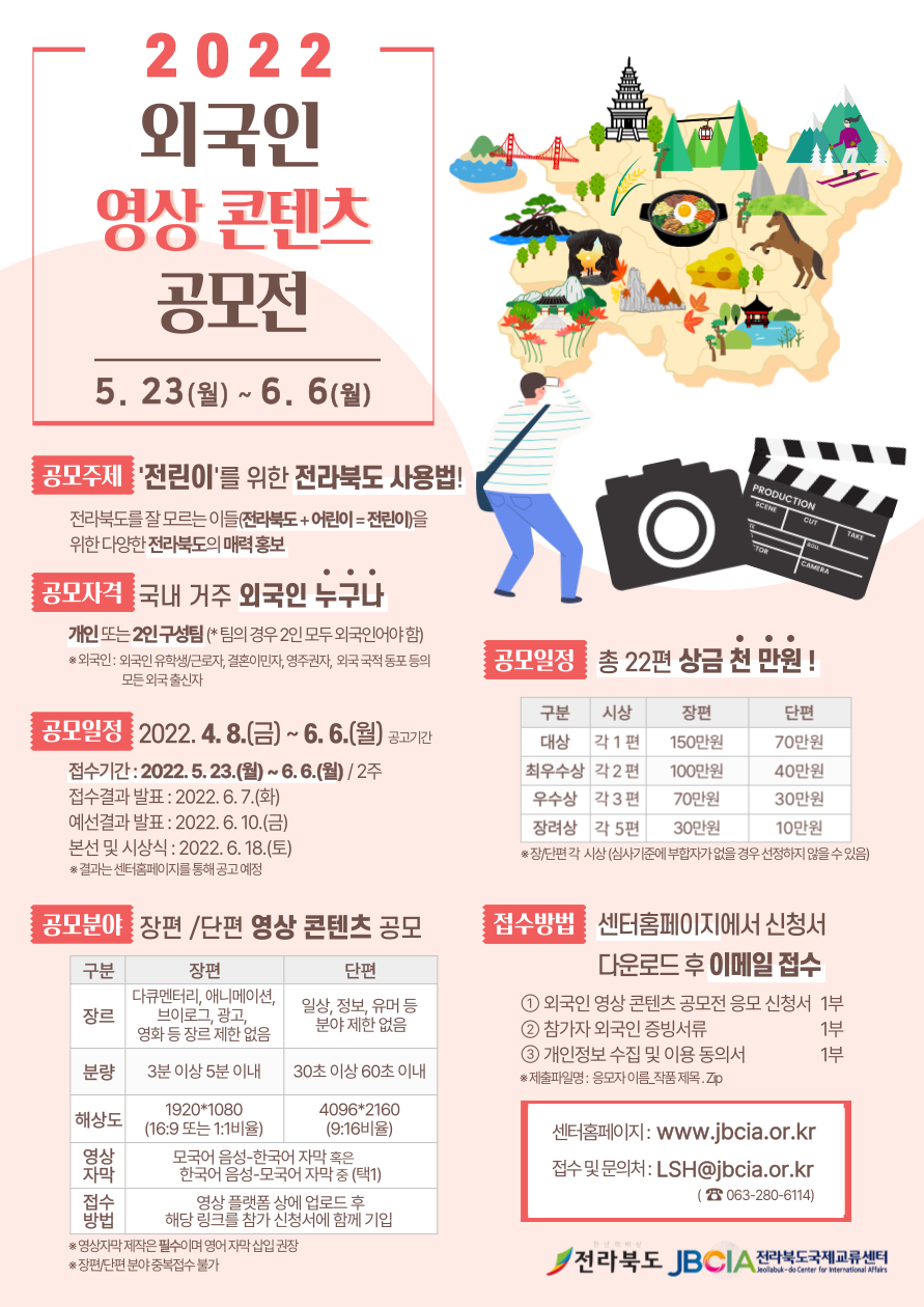 - 제출서류 : 외국인 영상콘텐츠 공모전 응모신청서 1부, 참가자 외국인 증빙서류 1부, 개인정보 수집 및 이용 동의 1부