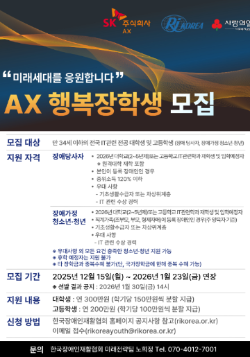 AX 행복장학금은 SK㈜ AX 구성원들의 따뜻한 성금으로 조성된 장학 프로그램으로, IT 전문가를 꿈꾸는 장애 당사자 및 장애 가정 청년들이 자신의 가능성을 실현하고 더 큰 미래로 나아갈 수 있도록 지원합니다.