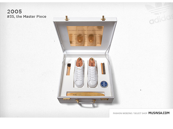 사진으로 볼 수밖에 없는 위의 모델은 2005년에 발매된 슈퍼스타 컬래버레이션 #35 모델. 별칭은 '마스터피스'로 불린다. 가장 희귀하고 가장 럭셔리한 모델로 통하는 이 스니커즈는 쉘-토부터 밑창까지 최고급 가죽만 사용하여 수작업으로 만들었다. 뿐만 아니라 도금된 화이트 케이스에 같은 방식으로 만든 클리닝 키트까지 함께 발표, 전세계 콜렉터들의 애간장을 녹이는 아이템이 되었다.