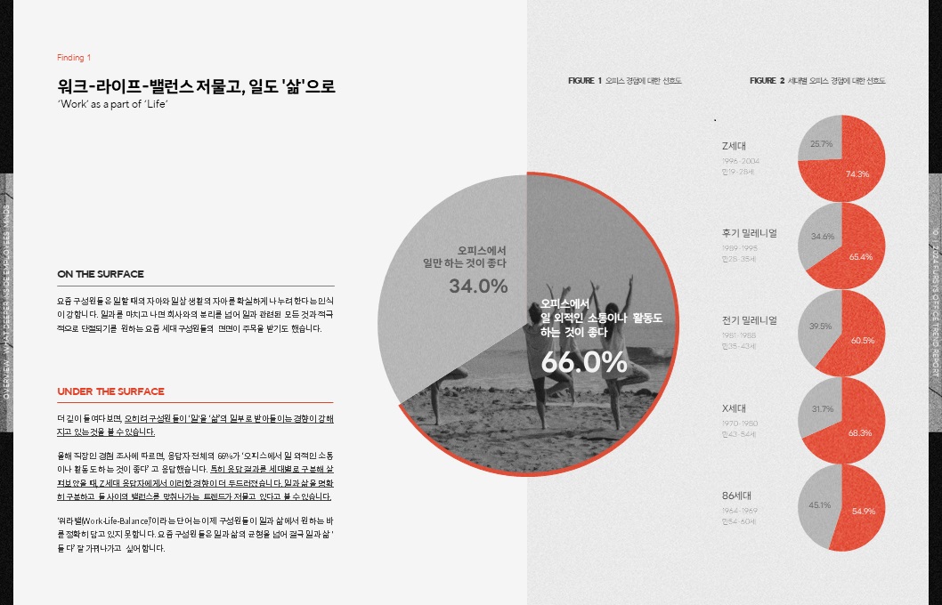 직장인들이 오피스와 회사생활에서 경험하는 바에 대해 심도 있게 다루고 있는 직장인 경험 조사 결과를 통해서, 요즘 구성원들은 회사에서 일할 때의 자아와 일과를 마친 후 일상의 자아를 확실히 분리하려 한다는 보편적인 인식과는 다르게, 일도 삶의 일부로 받아들이는 경향이 강해지고 있다는 것을 볼 수 있다. 응답자 중 66%가 오피스에서 일 외적인 소통이나 활동도 하는 것이 좋다고 답한 가운데, 특히 Z세대 응답자들은 이러한 경향을 더욱 두드러지게 보여주었고, 이를 통해 일과 삶을 구분하는 워라밸(Work-Life Balance) 트렌드가 저물고 있다는 것을 알 수 있었다.