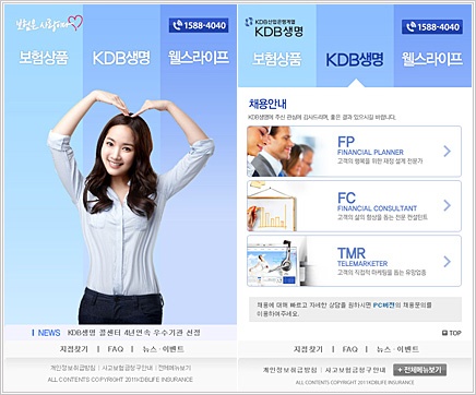 리뉴얼된 KDB생명 모바일 웹은 사용자가 PC에 접속하지 않아도 쉽게 보험정보를 습득할 수 있도록 구축했고, 위치정보도 제공한다. ‘브랜딩 + 마케팅+ 서비스’라는 KDB생명 웹사이트의 3원화 전략과 동일한 전략을 수용하여 KDB생명만의 브랜드 아이덴티티를 보여주는 한편, 디자인적으로는 천편일률적으로 아이콘화 되어 있는 디자인을 3단 레이아웃으로 구현하여 타 모바일 웹과 차별화를 꾀했다