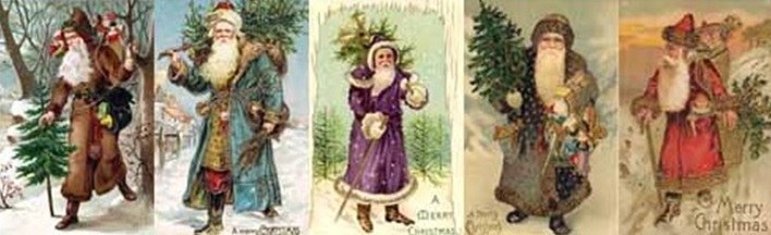 빨간색 외에도 청색, 보라색, 갈색 등, 여러 색의 옷을 걸친 산타클로스들.