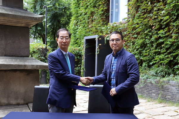아라리오뮤지엄 김지완 디렉터(우)와 기후변화센터 한덕수 이사장(좌)이 상호 업무 협약을 체결한 뒤 악수하고 있다. ⓒARARIO MUSEUM