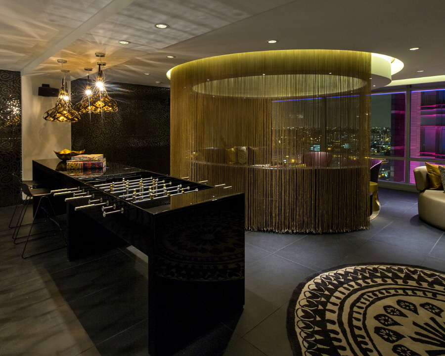 입구는 청동과 레진으로 만든 나비 설치물로 고객을 맞이한다. 이는 콜롬비아 작가 가브리엘 가르시아 마르퀘즈(Gabriel Garcia Marquez)의 ‘One Hundred Year of Solitude’에서 영감을 받은 것으로 유기적인 형태의 금색 줄 천장과 우아함을 자아내는 곡면형 가구로 채워진 홀과 리빙룸으로 퍼져나간다. 특히 콜롬비아 특유의 그래피티 문화를 담아낸 버티고 그래피티(Vertigo Graffiti)의 벽면은 검은 가죽과 자주색 벨벳으로 이루어진 기하학 형태와 사뭇 조화를 이룬다.
