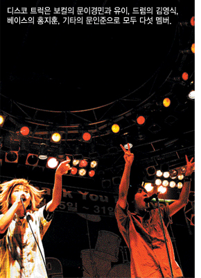 오 영원한 친구, 오 행복한 마음~” 이제는 대학 축제 때나 들을 법한 이 고전(?) 가요에 요에 “아싸라비아, 딱 걸렸어” 같은 요즘 유행어를 랩으로 곁들인 정체불명의 음악. 넓디 넓은 무대 위에서 그야말로 방방 뛸 때가 가장 재미있다고 입을 모아 말하는 이 밴드가 디스코 트럭이다. 그들이 하는 음악처럼 이름 역시 재미있다. 80년대 한창 유행하던 디스코의 리듬과 트럭처럼 육중한 메탈 사운드를 하고 싶다는 맘에서 짓게 된 특이하지만 직설적인 이름.