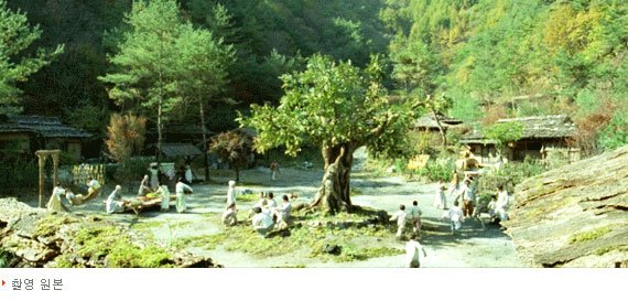 동막골이라는 신비한 마을이 처음 스크린에 보여지는 장면으로, 촬영 당시 계절이 가을이어서 여기저기 나무가 붉게 물든 부분을 여름색으로 돌리고, 미니어쳐로 만들어진 나무의 디테일을 중점으로 보완했습니다.