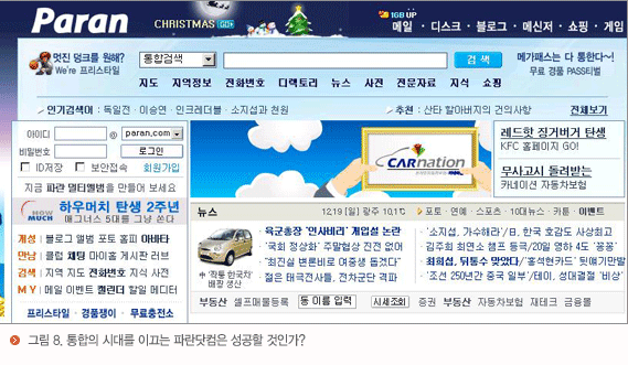 서비스를 션택적으로 분화시켜 집중력을 가지려던 오프라인식의 전략은 온라인에 맞지 않았음이 드러났습니다. 온라인은 뭉치면 살고 흩어지면 죽습니다. 이는 아직까지 온라인 업계가 정리가 되지 않은 성장중인 시대임을 잘 알려줍니다. 성장이 활발하게 이루어질 때는 한곳에 착 달라붙어 있는 것이 효율적입니다.