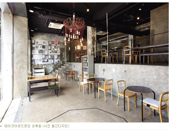 그 이름에서 짐작할 수 있듯이 테이크아웃드로잉(이하 tod)의 ‘주’는 드로잉이다. 테이크아웃드로잉은 드로잉을 주제로 작품을 소개하고 현대미술작가들이 제안하는 드로잉을 지지하며 드로잉을 실천하는 방법을 찾는 곳이다. 성북동과 동숭동, 한남동 총 세 곳에 tod이 있다. 겉모습은 일반 카페와 다르지 않다. 차와 빵을 팔고 테이블에 앉아 마시고 먹을 수 있다. 그 부분을 제외한 모든 점이 일반 카페와 다른 점이다.
