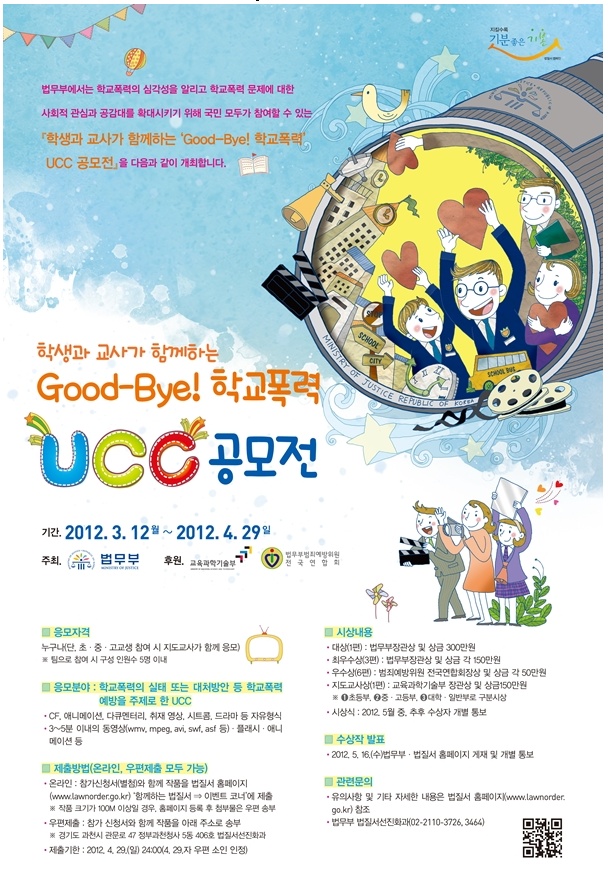 키기 위해 국민 모두가 참여할 수 있는 『학생과 교사가 함께하는 ‘Good-Bye! 학교폭력’ UCC 공모전』을 다음과 같이 개최합니다. 여러분의 많은 참여 바랍니다.