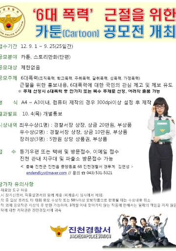 ▶ 참가자 유의사항 - 모든 재료와 도구 허용 - 반드시 참가신청서, 작품설명서와 함께 제출 (미제출시 심사에서 제외) ※첨부파일 참고 - 응모작 중 입상 후라도 타 대회 응모 수상작 또는 50%이상 모방작품으로 판명될 때는 수상 내용 취소 - 입상작 외에 응모작은 시상식 후 반환 가능하며, 3개월 이내 찾아가지 않는 작품에 한해서는 일체의 책임을 지지 않음 - 입상작에 대한 저작권은 진천경찰서에 귀속