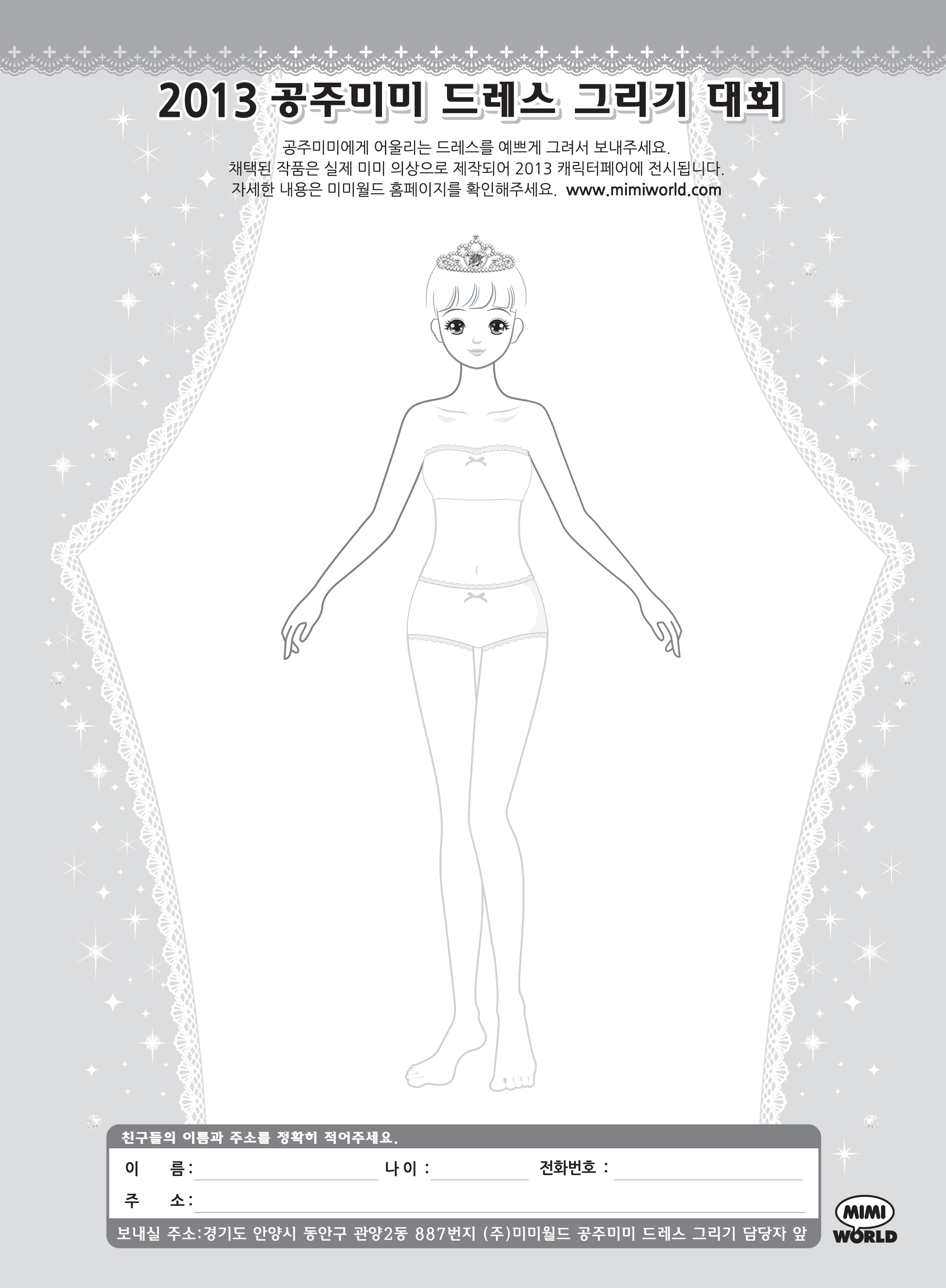 ※ 보내실 곳 : (403-062) 경기도 안양시 동안구 관양2동 887번지 (주)미미월드 공주 미미드레스 그리기 대회 담당자(앞)