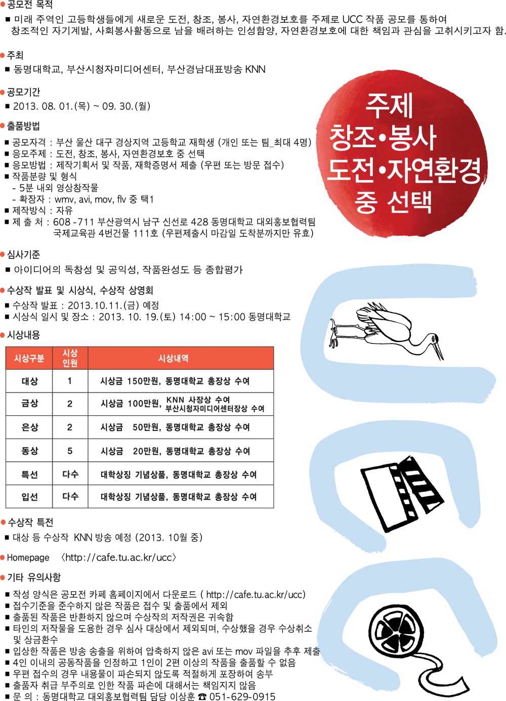 - 수상작 발표 : 2013. 10. 11.(금) 예정 -동명대학교 UCC공모전 카페 (http://cafe.tu.ac.kr/ucc)