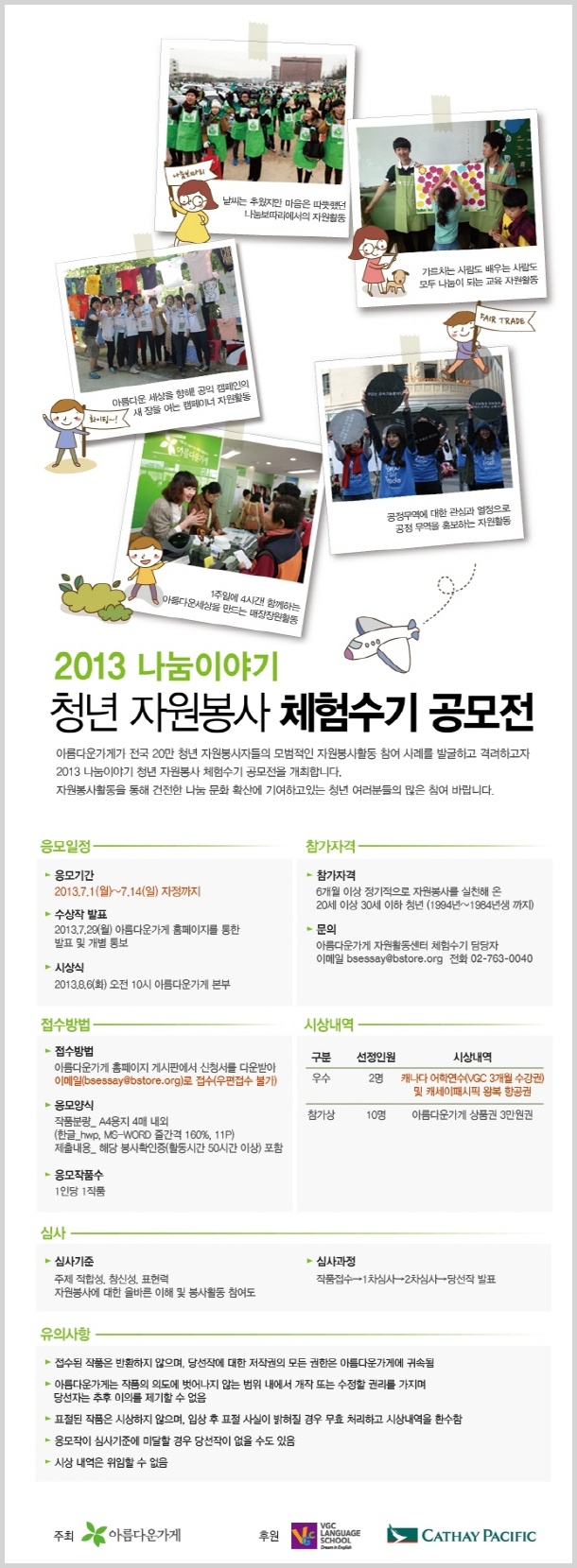 - 아름다운가게가 전국 20만 청년 자원봉사자들의 모범적인 자원봉사활동 참여 사례를 발굴하고 격려하고자  2013 나눔이야기 청년 자원봉사 체험수기 공모전을 개최합니다.