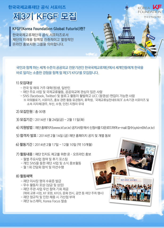 국민과 함께하는 세계 수준의 공공외교 전문기관인 한국국제교류재단에서 세계인들에게 한국을 바로 알리는 소중한 경험을 함께 할 제3기 KFGF를 모집합니다.