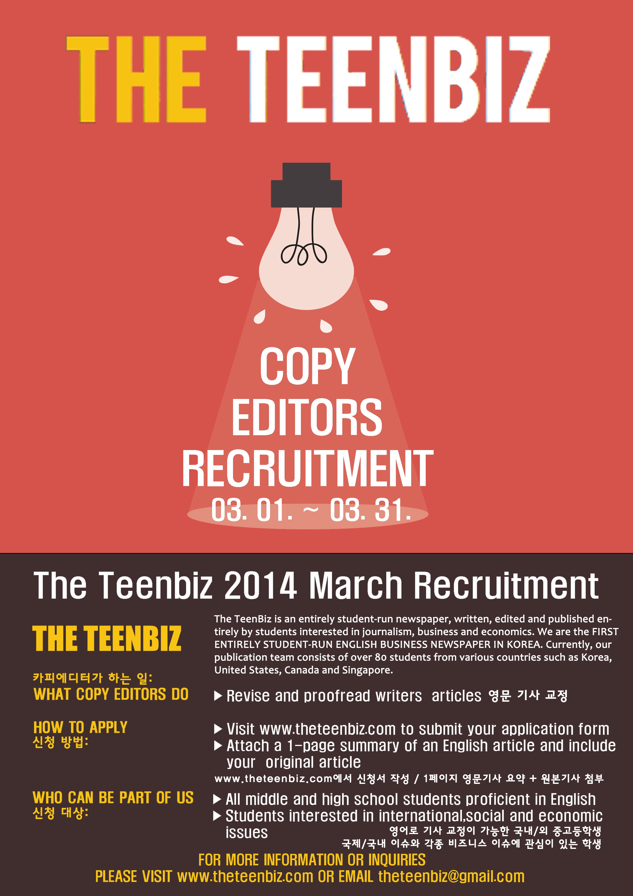청소년 영자 비즈니스 신문, The TeenBiz 카피 에디터 모집