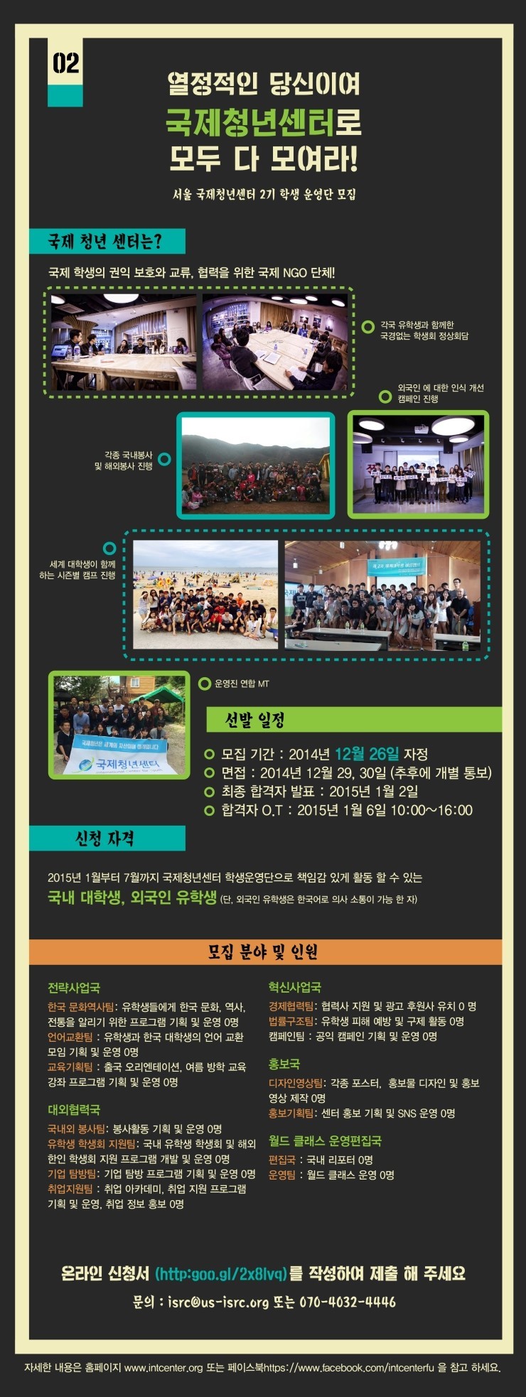 - 2015년 1월부터 7월까지 국제청년센터 학생운영단으로 책임감 있게 활동 할 수 있는 국내 대학생, 외국인 유학생.