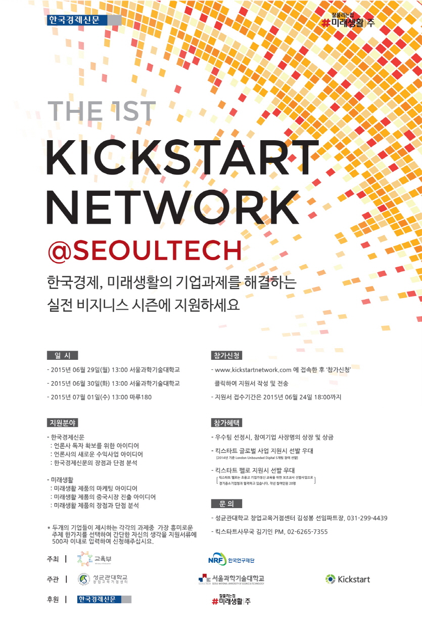 체계화된 취∙ 창업 교육 프로그램 및 전문가 컨설팅을 통하여 비즈니스에 대한 경험을 쌓을수 있으며 다양한 분야의 전문가들과 소통의 계기를 마련해줄 ‘킥스타트 네트워크’ 실전 비즈니스 대회! 미래의 글로벌 리더로 성장할 대학생 여러분들의 많은 참여 부탁드립니다.