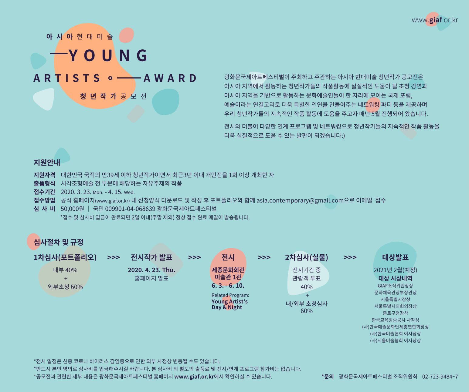 공모전과 관련된 세부 내용은 광화문국제아트페스티벌 공식 홈페이지(https://www.giaf.or.kr/2020young)에서 확인하실 수 있습니다.
