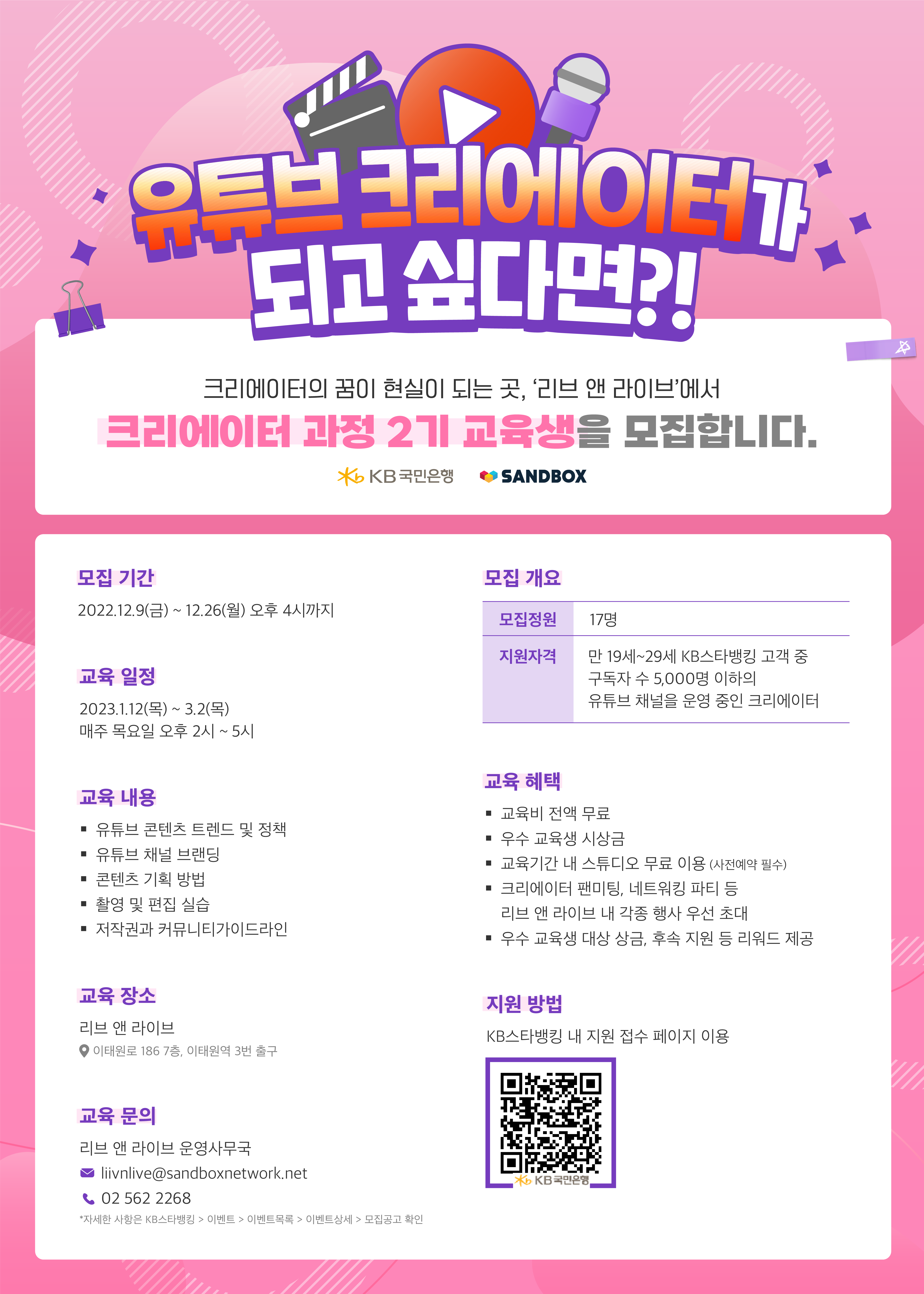 해당 과정은 이태원에 위치한 KB국민은행의 콘텐츠 스튜디오 ‘리브 앤 라이브(Liiv & Live)’에서 진행되는 크리에이터 대상 오프라인 교육과정으로, 콘텐츠 기획, 유튜브 채널 운영 방법 등의 이론 교육과 영상 촬영, 편집 방법 등의 실습 교육을 진행하며 크리에이터로서 갖춰야 할 기본 역량을 학습합니다.
