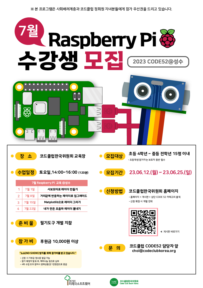 - 라즈베리파이 3B+보드 교구 난이도로 인해 초등학생 참가자의 경우 보호자 동반 수업으로 진행됩니다.