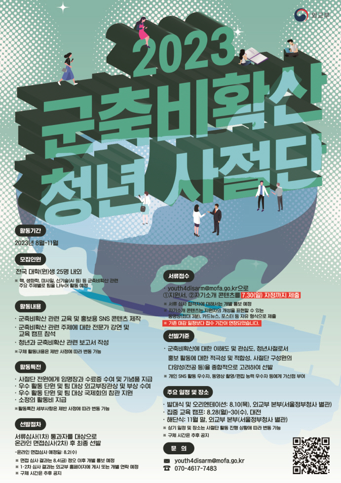 - 외교부 군축·비확산담당관실은 △군축·비확산 관련 청년의 참여 증진, △군축·비확산에 대한 국민적 이해 및 관심 제고, △우리나라 주도로 유엔 총회에서 채택된 “청년과 군축·비확산 결의(Youth, Disarmament, and Non-proliferation Resolution)” 홍보 등을 위해 <2023 군축·비확산 청년사절단>을 모집하여 운영합니다.