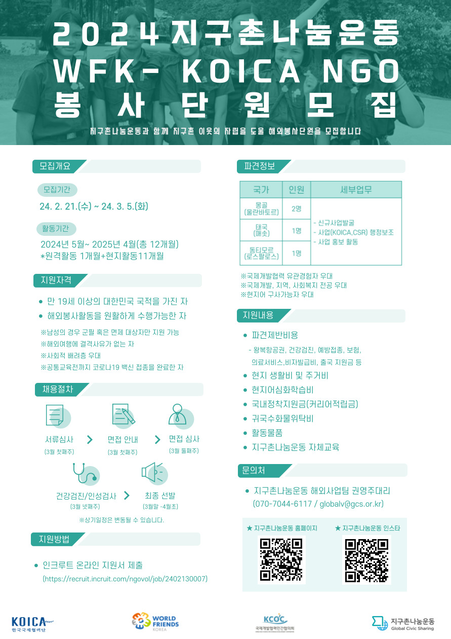 지구촌나눔운동에서는 현장에서 나눔을 실천할 수 있는 봉사단원을 모집합니다! 현장활동비 지원받으먀 해외업무경험을 쌓아보세요 :)