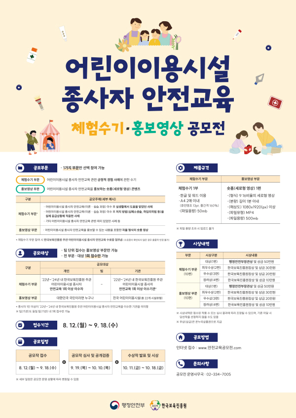 ※ 2개 부문(체험수기 · 홍보영상) 중 1개 부문만 선택 참여 가능 ※ 체험수기 부문 참여 시 한국보육진흥원 주관 어린이이용시설 종사자 안전교육 수료증 첨부 必(수료증이 확인되지 않는 경우 출품작 인정 불가) |